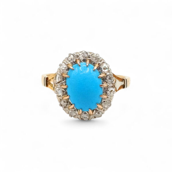Ten antyczny pierścionek z turkusem i diamentami powstał w epoce, w której biżuteria była tworzona z myślą o trwałości i harmonii kamieni. Intensywny błękit turkusu otoczony jasnymi diamentami tworzy kompozycję, która przyciąga uwagę naturalnym kontrastem barw.