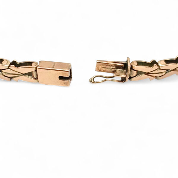 Na uwagę zasługuje również konstrukcja samej bransoletki. Ogniwa mają wyraźny, rytmiczny rysunek, a całość zamyka zapięcie szufladkowe z zabezpieczeniem, typowe dla biżuterii wykonywanej z myślą o trwałości i wygodzie noszenia.