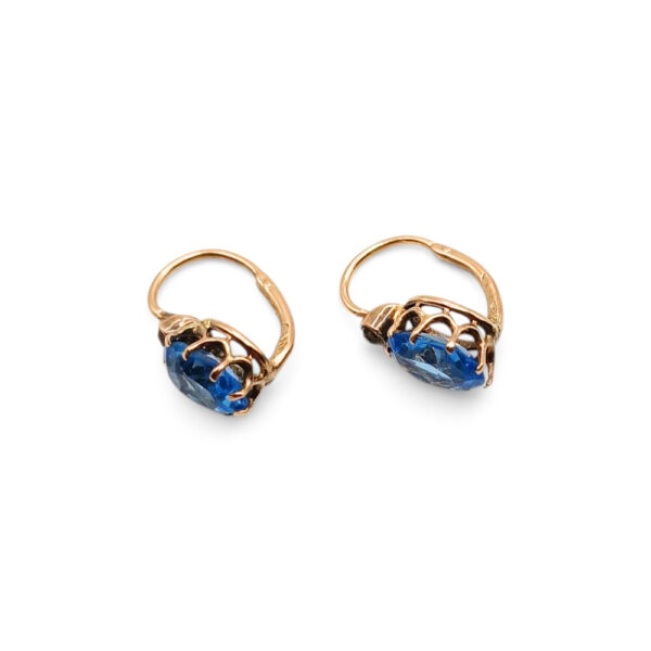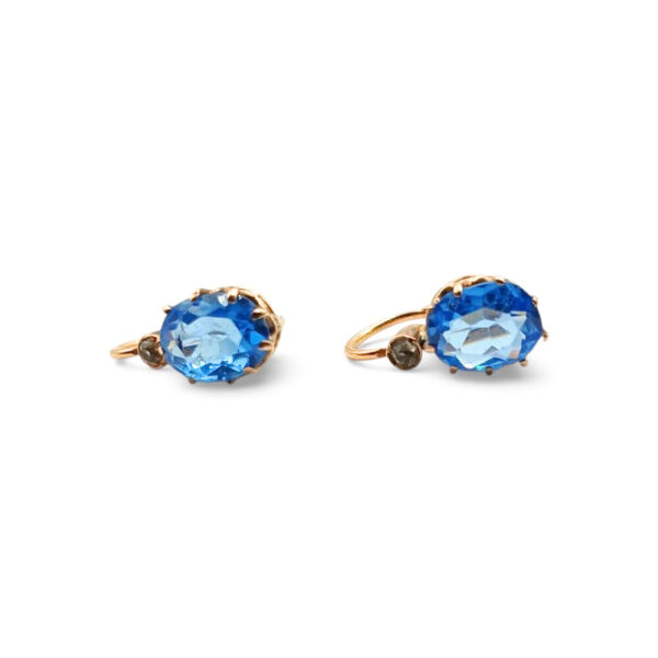 Te kolczyki łączą subtelny blask topazów z delikatną oprawą diamentów w historycznym szlifie. Ich lekka forma i klasyczne zapięcie sprawiają, że biżuteria zachowuje elegancję charakterystyczną dla połowy XX wieku.