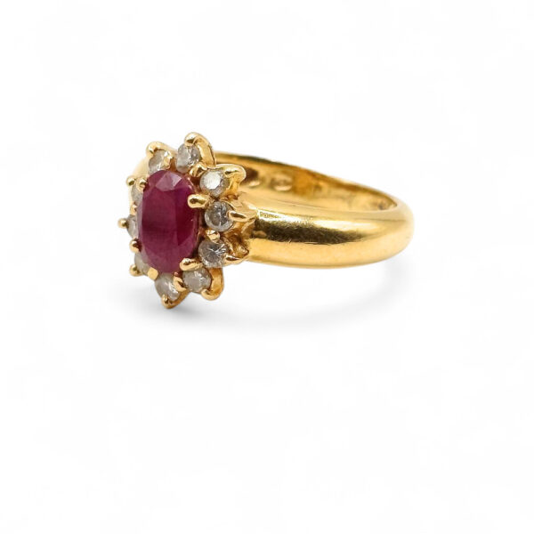 Centralny rubin fasetowany o owalnej formie został otoczony diamentami, które tworzą charakterystyczną aureolę światła. Taki układ kamieni podkreśla głębię koloru rubinu i nadaje całości elegancki charakter.