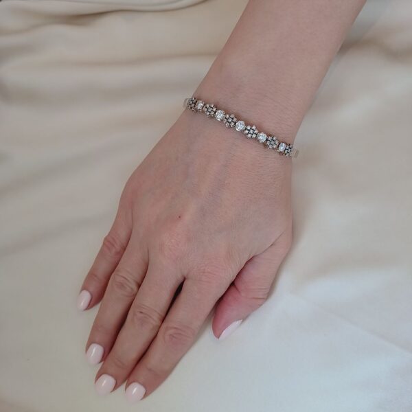 Ta bransoletka przyciąga uwagę rytmiczną kompozycją, w której pojedyncze diamenty przeplatają się z dekoracyjnymi, kwiatowymi układami. Subtelna gra światła i zróżnicowanie form nadają jej lekkości, mimo wyraźnej, solidnej konstrukcji.