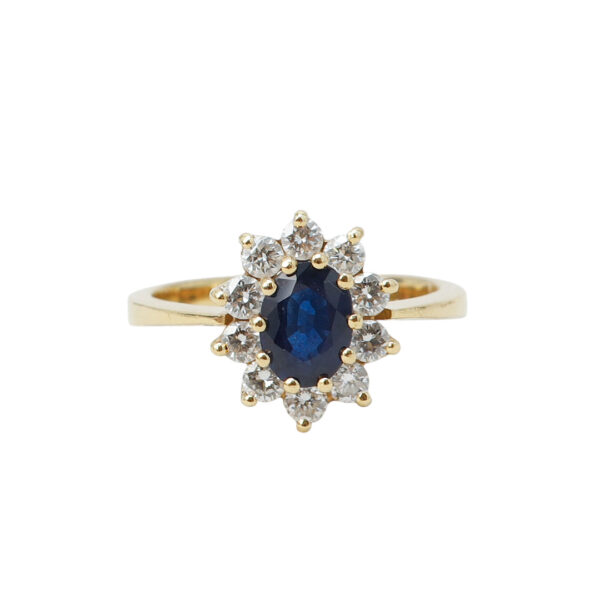 Centralne szafiry otoczone diamentami przywołują jedną z najbardziej rozpoznawalnych form jubilerskich – kompozycję w stylu Diana.
