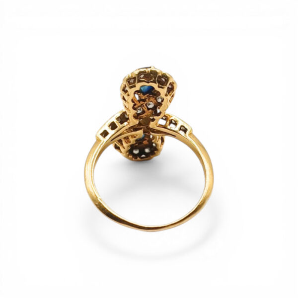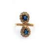 Antyczny wyrób jubilerski w formie pierścionka z podwójną ekspozycją szafirowo – diamentową.