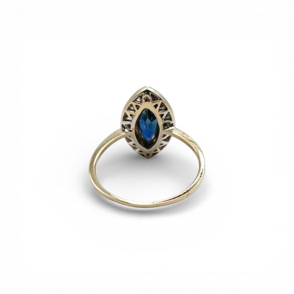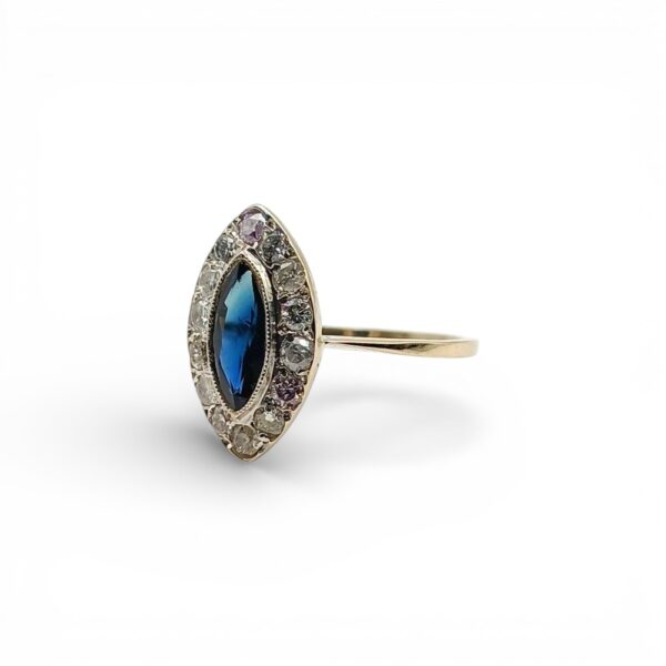 Wyrób jubilerski w formie pierścionka z szafirem i diamentami.