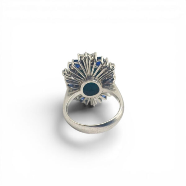 Pierścionek platynowy z turkusem szafirami i diamentami