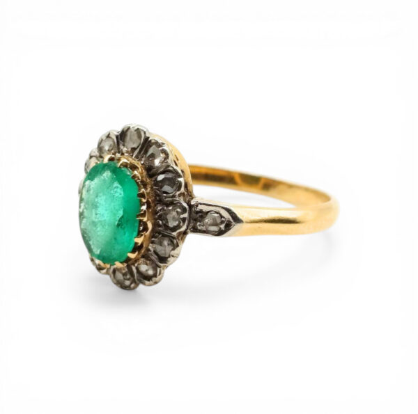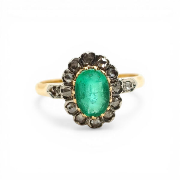 Antyczny wyrób jubilerski w formie pierścionka z diamentami i szmaragdem.